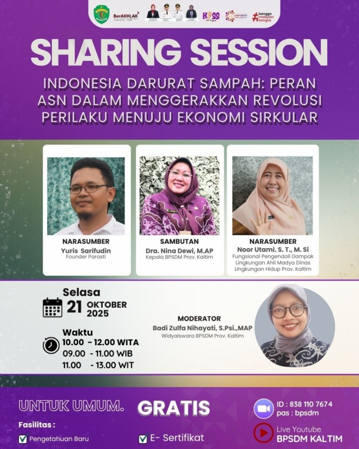 Mengikuti kegiatan Sharring Session "Tema : INDONESIA DARURAT SAMPAH Peran ASN dalam menggerakan Revolusi Prilaku menuju Ekonomi Sirkular oleh BKPSDM Provinsi Kal-Tim.