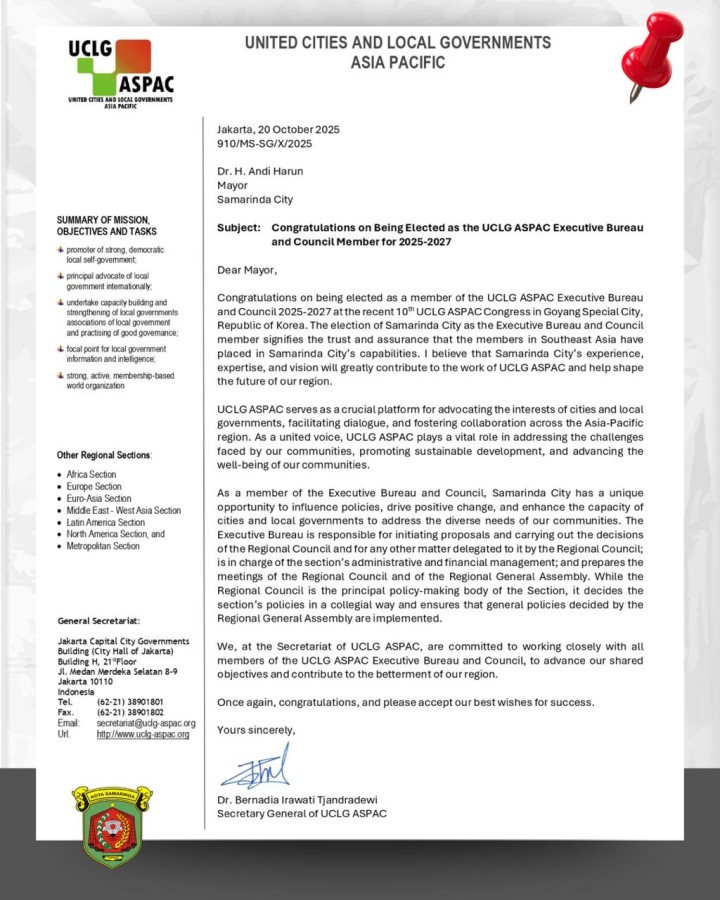 Walikota Samarinda resmi terpilih sebagai Co-President UCLG ASPAC (United Cities and Local Governments Asia Pacific) — sebuah organisasi bergengsi yang menaungi pemerintahan kota dan daerah di kawasan Asia Pasifik. Kepercayaan global ini menjadi kehormatan besar sekaligus pengakuan internasional atas komitmen dan kiprah Kota Samarinda dalam mewujudkan tata kelola pemerintahan yang inovatif, inklusif, dan berkelanjutan. Dengan posisi strategis sebagai anggota Dewan Eksekutif (Executive Council) periode 2025–2027, Wali Kota Samarinda akan turut berperan dalam merumuskan arah kebijakan pembangunan perkotaan di kawasan Asia Pasifik, serta membawa suara Kota Samarinda dalam pergaulan kota-kota besar dunia dalam memperjuangkan kolaborasi global menuju pembangunan berkelanjutan (SDGs). Prestasi ini bukan hanya kebanggaan bagi Samarinda tetapi juga bagi Indonesia.